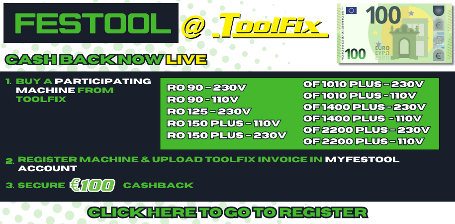 Please note this offer is managed and completed with Festool. All correspondence about cashback and registering for the offer can be done direct with www.festool.ie