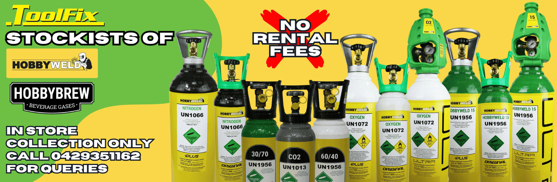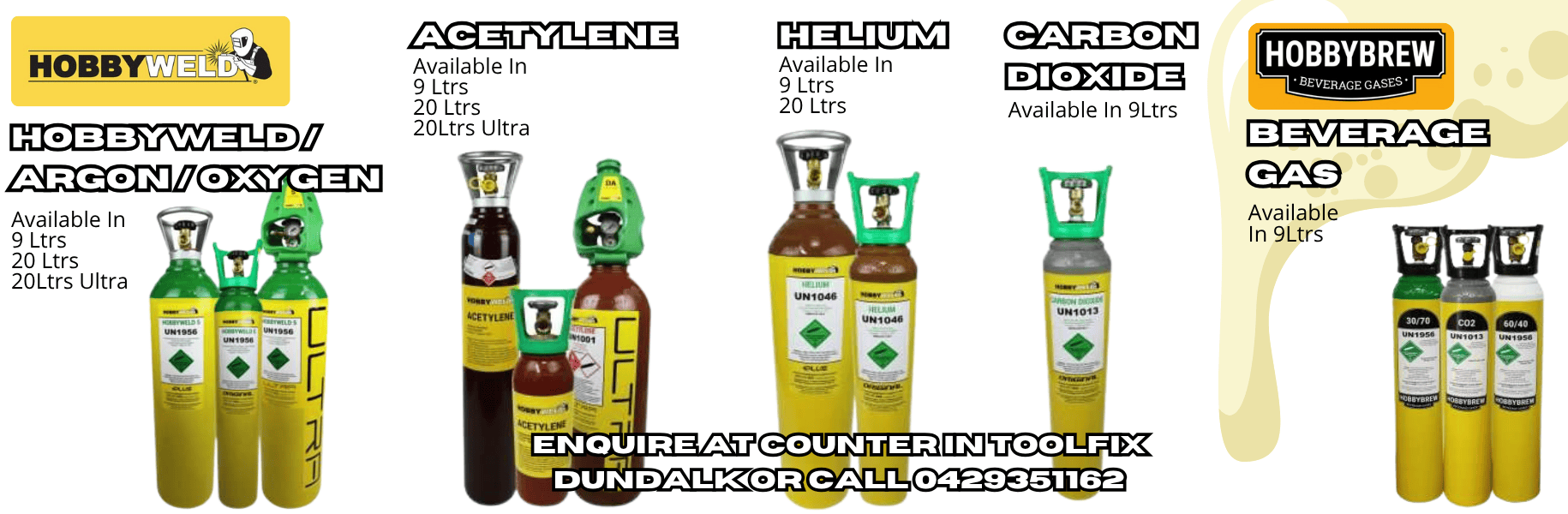 At ToolFix Dundalk we stock a full range of HobbyWeld and HobbyBrew Gases - servicing the greater Louth area as well as further afield.