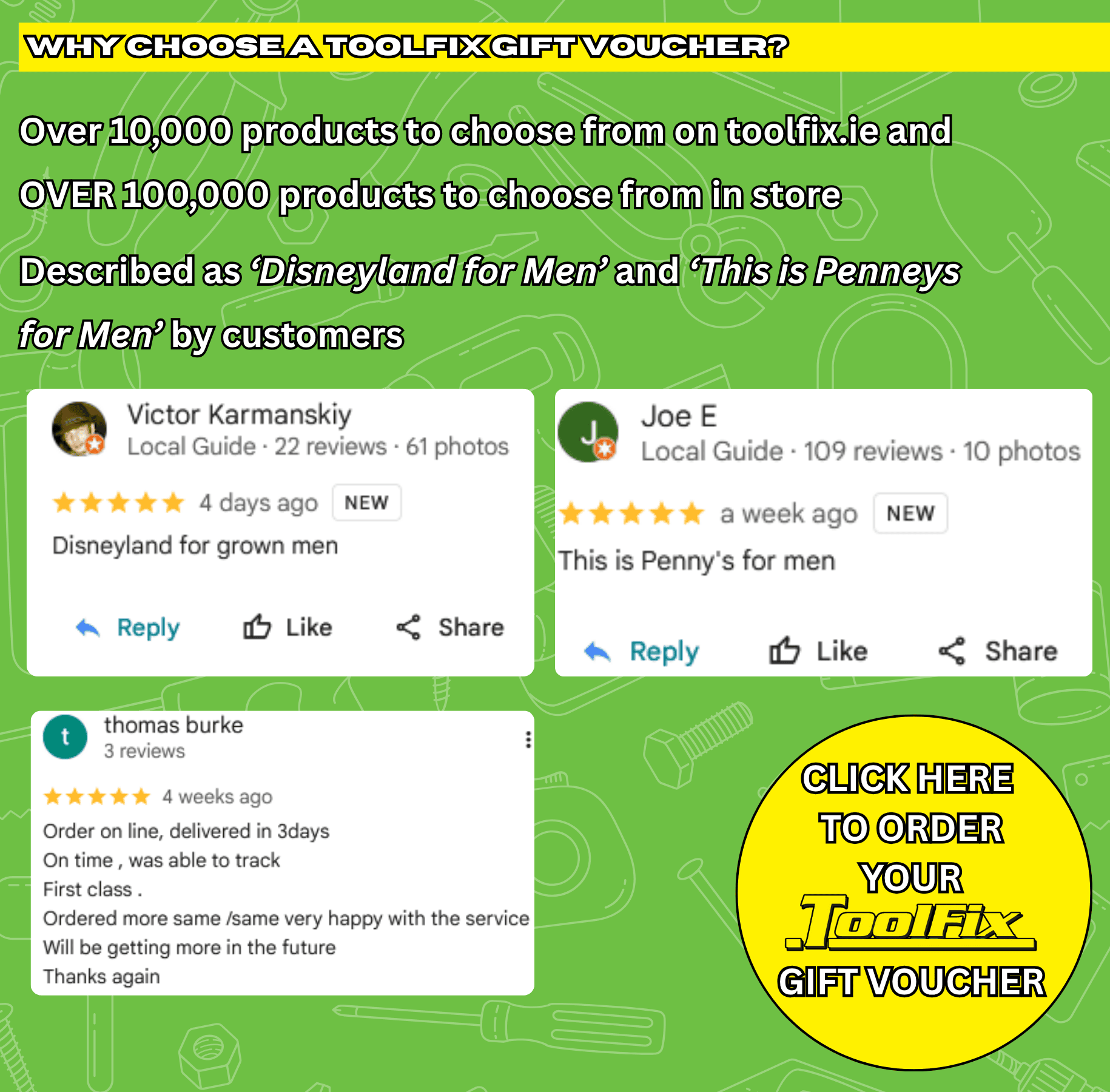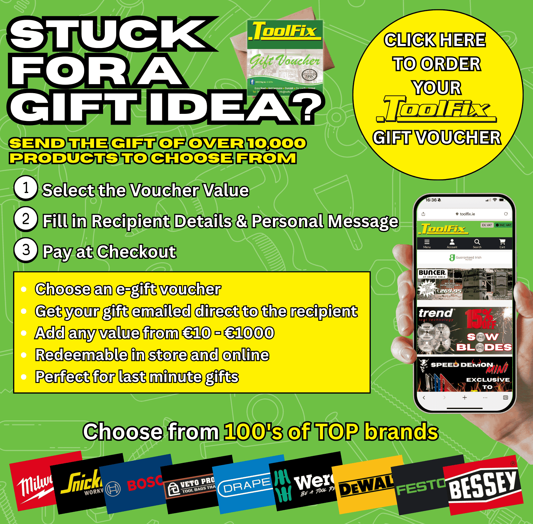Gift Vouchers can be purchased online HERE or in-store in ToolFix, Ecco Road, Dundalk, Co Louth, A91EWP7