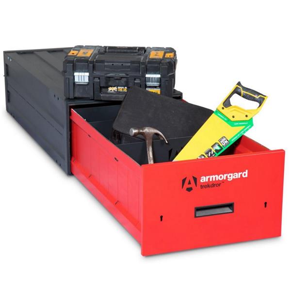 The Armorgard TKD1 TrekDror is a robust, stackable steel tool drawer designed for vans, workshops, and small spaces. Its smooth-sliding drawer and removable partitions allow tools—from power tools to small hand tools—to be neatly organized, while its compact design fits under shelves or between wheel arches.