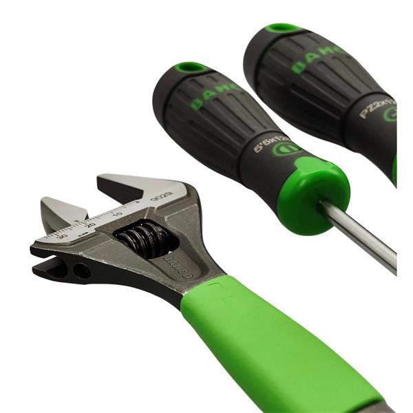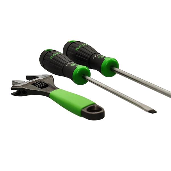 The Bahco 9029-B209-XE is a limited edition 6" adjustable wrench set, featuring a phosphated green ERGO™ handle for enhanced grip and comfort. This set includes two free screwdrivers, making it an ideal choice for professionals and DIY enthusiasts seeking a versatile and ergonomic toolset.