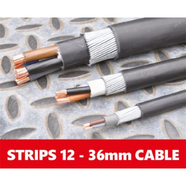 Scores armour strands to a uniform depth for a clean break off and trouble free gland connection. Automatic cable clamp applies constant pressure throughout the cut with no retightening necessary. Wide cable clamp ensures perfect blade to cable alignment for precise cuts. Rugged all-metal construction with integrated spare blade holder. Perfect results on cables from 12mm up to 36mmØ.