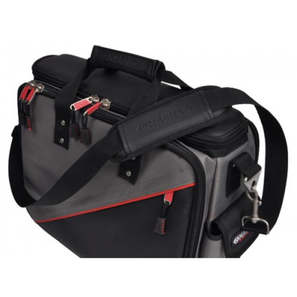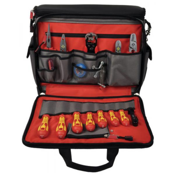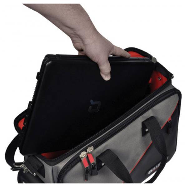 Durable polyester construction. Bright red inner lining for easy visibility of stored items. 50 pockets and holders including fold out panels for easy tool access. Padded handle and shoulder strap for maximum comfort. Padded central compartment fits laptop. Internal document pocket.