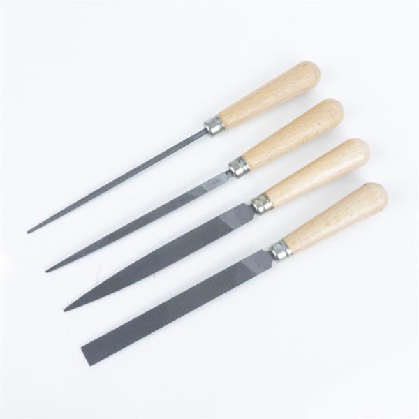 4-pieces set with wooden handles Manufactured from special file steel Second cut Contents: Triangular, Flat, Round and Flat tapered Blade length 100 mm Total length 160 mm