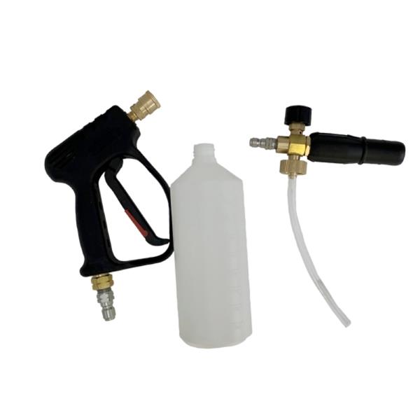 A versatile foam lance and trigger gun kit for pressure washers, featuring a 1-litre detergent bottle, adjustable foam thickness, and spray pattern control. Designed for quick connection via 3/8″ male quick-release coupling, it handles pressures up to 4000 PSI and temperatures up to 60°C. Ideal for agricultural, industrial, and domestic cleaning—perfect for vehicles, machinery, patios, and more.