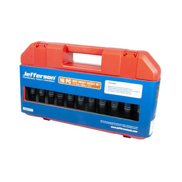 The Jefferson 16 Piece 1/2" Deep Metric Impact Socket Set (JEFISOC12-01) is a professional-grade toolkit designed for high-torque applications. Manufactured from durable chrome vanadium steel, each socket features a 6-point design and a black phosphate finish for enhanced corrosion resistance. The set includes 16 deep sockets ranging from 10mm to 32mm, making it ideal for automotive, mechanical, and industrial tasks. Supplied in a sturdy blow-moulded case, this set ensures organized storage and easy transport.