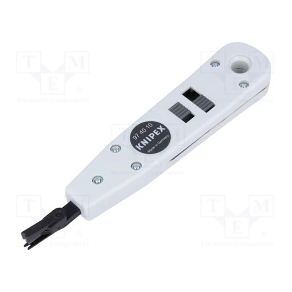 The Knipex 97 40 10 is a compact, 175mm punch-down tool designed for efficient insertion and cutting of wires into LSA-Plus and similar IDC (Insulation Displacement Connector) blocks. It combines two functions—pushing down and cutting—in a single operation, streamlining the termination process for UTP and STP cables.