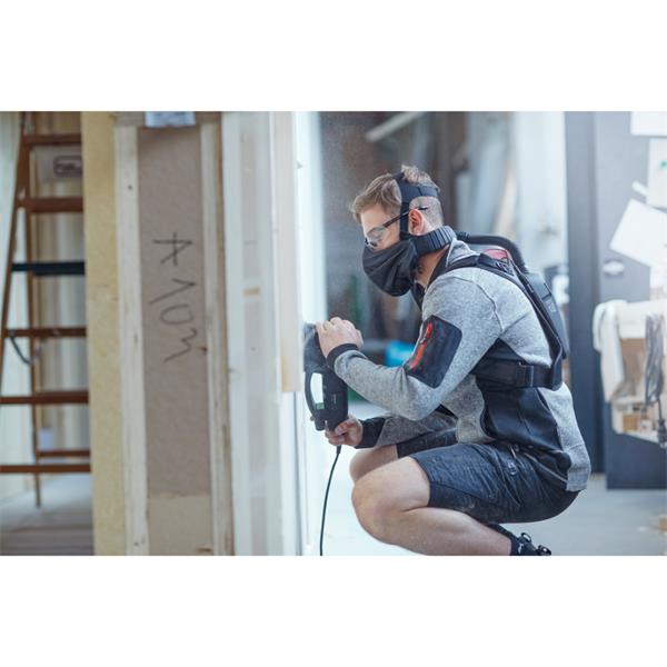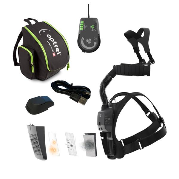 The Optrel 4700.010 is a Powered Air-Purifying Respirator (PAPR) system featuring a flame-retardant half mask and an integrated control panel. It delivers filtered air directly to the user, providing protection against airborne particles while reducing breathing effort.