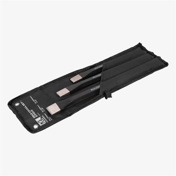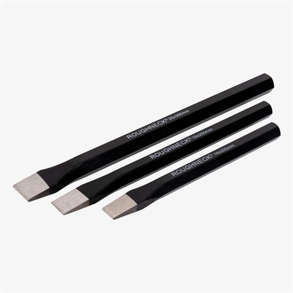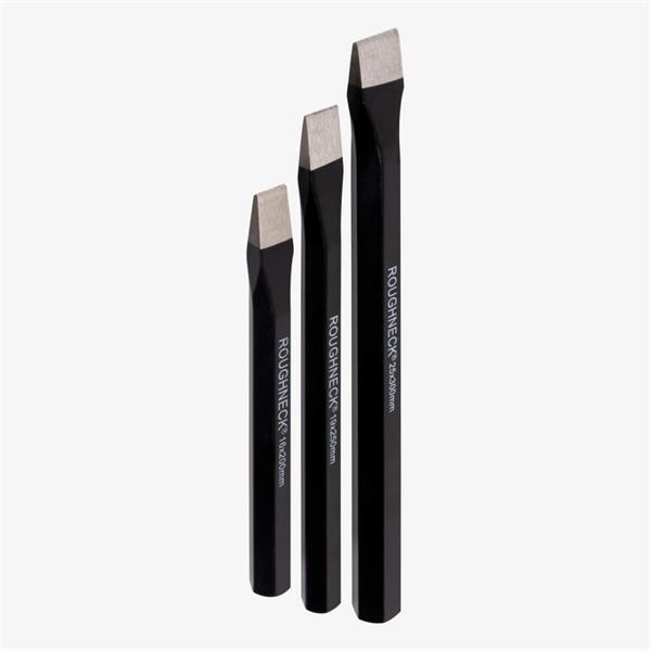 The Roughneck Cold Chisel Set is supplied with a heavy duty canvas tool roll. Manufactured from drop forged, heat treated steel for strength and durability. Powder coated with polished tips for greater corrosion resistance.