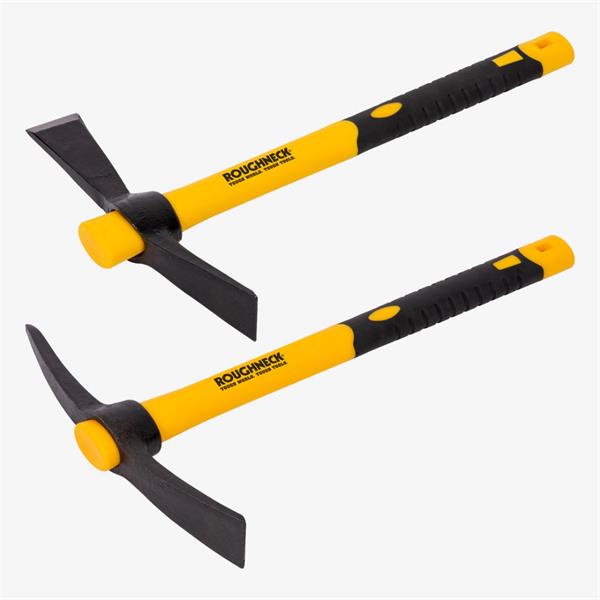 The Roughneck Micro pick and cutter mattock set with an overall length of 380mm/15", is perfect for working in confined spaces. The twin pack contains one micro pick ideal for hard ground and removing mortal, and one cutter mattock ideal for soft ground and cutting roots. Strong yet lightweight, with fibreglass core handles that feature soft grips for comfort. Drop forged, heat treated and powder coated for maximum strength and durability.