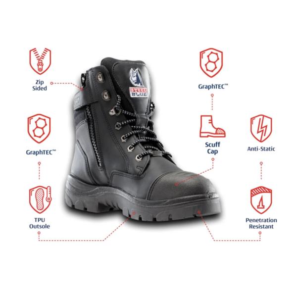 Steel Blue Southern Cross Zip GraphTEC Scuff S3 - Black are men’s ankle-height, zip-sided safety boots designed for extreme durability, comfort, and protection, using graphene technology for world-leading abrasion resistance and boot strength.
