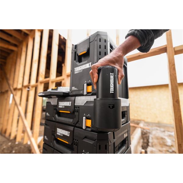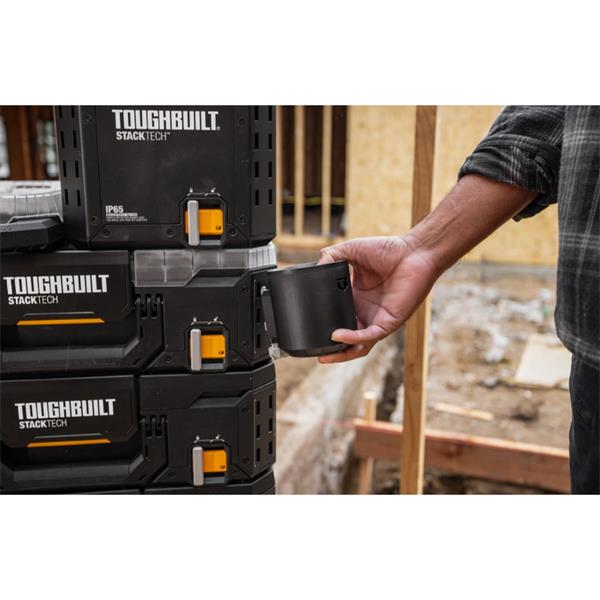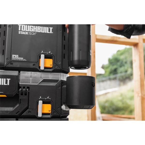 • Integrated StackTech cup holder mounts securely on StackTech toolbox accessory rails and ToughBuilt Garage slot tiles/rails