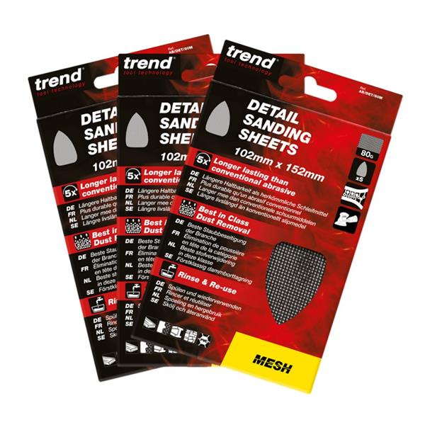 The Trend Detail Sanding Sheets 102mm x 151mm Triple Pack is a set of sanding sheets designed for efficient sanding with improved dust removal, durability, and reusability.