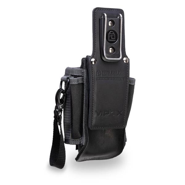 The MP1X is a small-sized tool pouch with both a leather Pocket Stuffer™, that easily slips into pants pockets for a quick retrieval, as well as wire-formed clip for securing to belts and Veto tool bags. Ideal for a minimum amount of electrical or networking tools the MP1X features 3 main pockets sized for linesmen, needle nose or snips and a pair of drivers. A pair of thru-pockets accommodate long shank or handled tools and 6 pen-sized pockets complete the sides of the pouch. The MP1X is topped off with a flush mounted stainless steel tape measure clip.