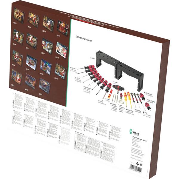 The 2025 Wera Advent calendar includes a comprehensive screwdriving workshop for the most common screw profiles and screwdriving operations. The two included racks can be placed upright or hung on the wall. The giftee can look forward to 28 surprises: 15 screwdrivers, two of them slotted for VDE, 2 Stubbys, 3 Micro tools for precision engineering and a chiseldriver with impact cap and pound-thru blade.
